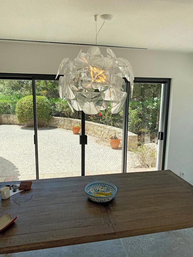 Castlestones im Sommerhaus – auch das funktioniert hervorragend. Gewählt wurden variable Plattenformate von 91 x 91 cm und 123 cm x 59, 78 und 90 cm der Castle Stones Loft in der Farbstellung Morning Mist.