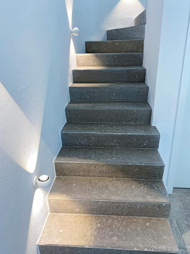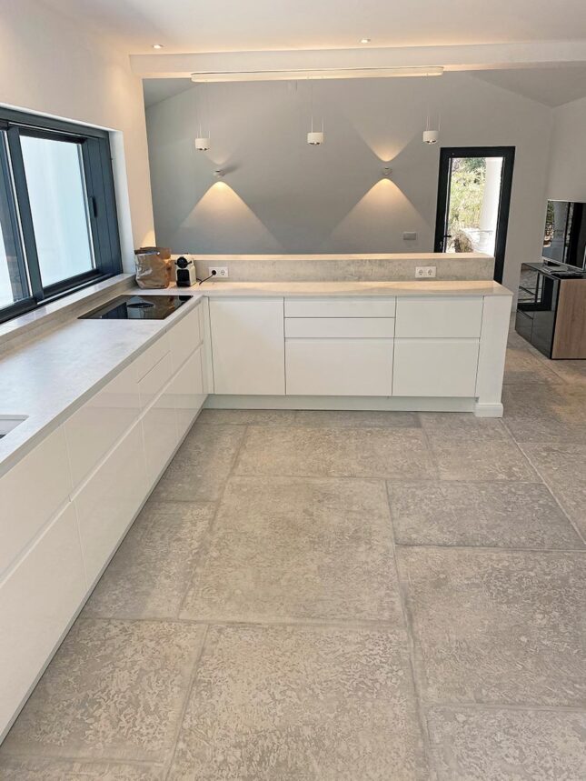 Die großen Platten wurden direkt auf den Estrich verlegt. Unser Handwerkspartner, der über reichlich Erfahrung mit Castlestoens verfügt, konnte innerhalb von wenigen Tagen den gesamten Boden verlegen.